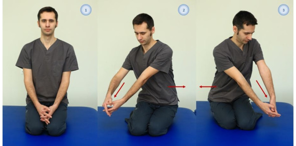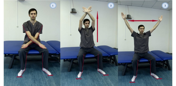 Рис. 15. Упражнение лечебной физкультуры, используется стол для Войта-Бобат терапии: 1. Исходное положение «сидя» руки сложены в локтях и перекрещены, кисти расположены на бедрах, ноги согнуты в коленных суставах, стопы слегка развернуты кнаружи; 2. Руки подняты вверх, слегка согнуты в локтях и перекрещены, ноги согнуты в коленных суставах, стопы слегка развернуты кнаружи; 3. То же положение с разведенными в стороны и выпрямленными руками. Выполняем упражнение 10—15 раз.