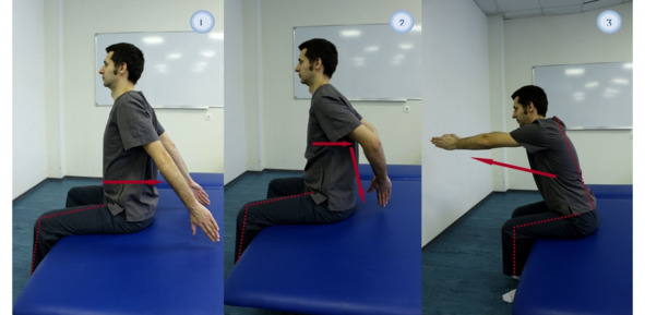 Рис. 16. Упражнение лечебной физкультуры, используется стол для Войта-Бобат терапии: 1. Исходное положение «сидя», руки выпрямлены отведены за спину, ноги согнуты в коленных суставах, стопы слегка развернуты кнаружи; 2. То же положение, но руки согнуты в локтях, задерживаем положение на 10 сек; 3. Руки выпрямлены вперед, ноги согнуты в коленных суставах, стопы слегка развернуты кнаружи. Тянемся корпусом вперед, оставляя спину прямой, задерживаем положение на 5—10 сек., возвращаясь в исходное. Выполняем 8—10 повторов.
