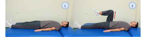 Рис. 18. Упражнение лечебной физкультуры, используется стол для Войта-Бобат терапии: 1. Исходное положение «лежа на спине», руки вдоль туловища; 2. То же положение с согнутой в коленном суставе и поднятой правой ногой, задерживаем положение 5—10 сек. Поочередно выполняем для левой и правой ноги по 10—15 повторов.