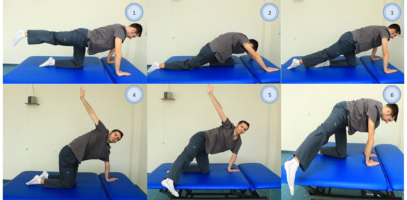 Рис. 20. Упражнение лечебной физкультуры, используется стол для Войта-Бобат терапии: 1. Исходное положение – «упор лежа», с опорой на левое колено и верхние конечности, правая нога выпрямлена; 2—6. Показана смена положений, выполняется 5 повторов всего комплекса.