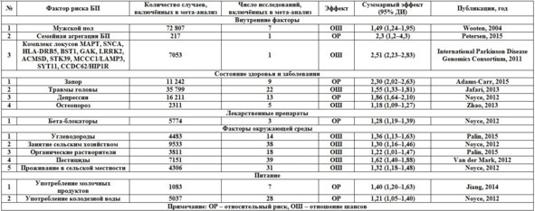 Некоторые факторы, влияющие на риск возникновения БП, можно считать установленными, остальные – необходимо исследовать в будущем, так как влияние тех или иных внешних факторов на риск развития БП имеет различную степень доказательной базы.