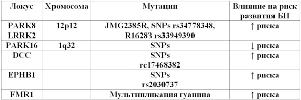 На сегодняшний день роль наследственного фактора в развитии БП несомненна, при всем изобилии генетических детерминант современные представления о БП базируются на том, что данное состояние является, прежде всего, мультифакториальным заболеванием (таб. 3), и наличие того или иного варианта мутации, может способствовать как повышению, так и снижению риска развития БП (таб. 4, 5). Кроме того, генетический фактор играет более важную роль в развитие БП с ранним началом.