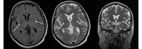 Рис. 14. Пример МР-томограмм пациентки 69 лет с «нейродегенерацией с отложением железа в мозге» (NBIA-Syndrom – Neurodegeneration with Brain Iron Accumulation). В проекции базальных ганглиев (отмечены стрелками) выявляются симметричные вытянутые зоны изменения МР-сигнала, неоднородного гипоинтенсивного МР-сигнала на Т2ВИ, Flair, изоинтенсивные на Т1 ВИ, что может соответствовать накоплению железа в базальных ганглиях.