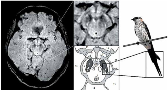 Рис. 15. МРТ (3 Тл, SWI) здорового человека, аксиальный срез на уровне нигросомы 1 с увеличением среднего мозга (справа, сверху) и схематическим изображением соответствующих анатомических структур (справа, снизу): 1 – красное ядро, 2 – покрышка среднего мозга, 3 – водопровод, 4 – периводопроводное серое вещество, 5 – медиальная петля, 6 – нигросома 1, 7 – черное вещество, 8 – ножки мозга, 9 – сосцевидное тело, 10 – интерпедикулярная ямка, 11 – зрительная лучистость, 12 – третий желудочек, 13 – височная доля, 14 – мозжечок, 15 – лобная доля [Schwarz S.T et al., 2014].