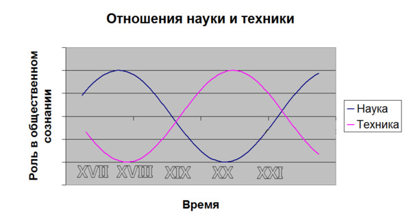 Подобного отношения науки техники мы не видели на обозримом историческом отрезке. Ниже приведена весьма условная схема отношений науки и техники. По вертикали отложена роль в мировоззрении социума, по горизонтали – временная шкала, что позволяет видеть какая из областей деятельности доминирует на том или ином временном отрезке и даже спрогнозировать дальнейшее развитие событий.