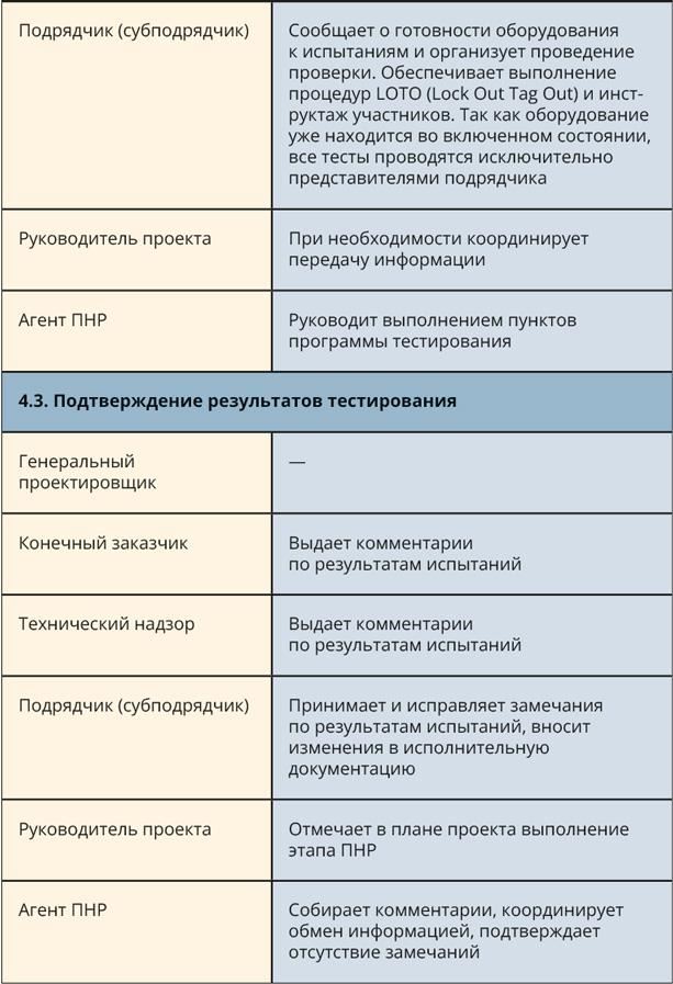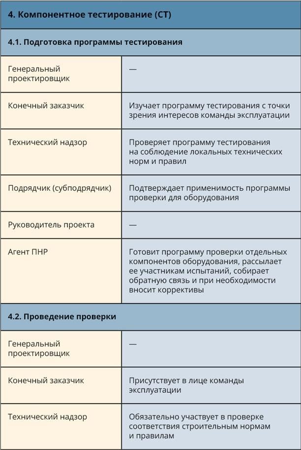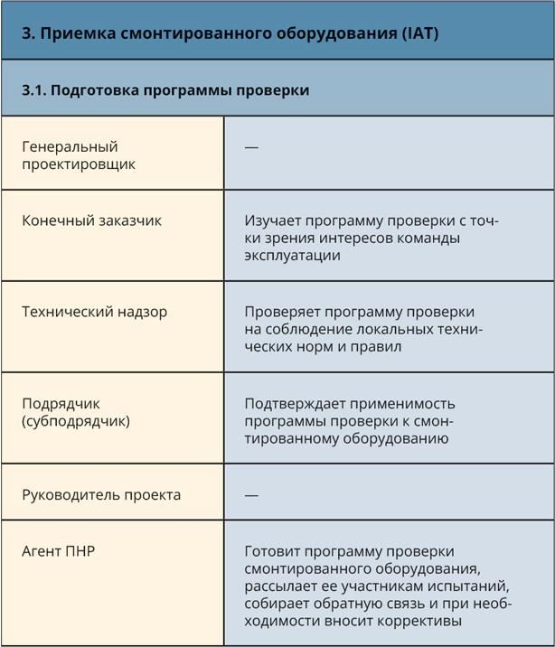 Для локальных или более мелких поставщиков разработку программы тестирования можно поручить агенту ПНР. Принципиальная разница в том, что при создании проекта часть оборудования берется с рынка и проект как бы подстраивается под спецификацию конкретных моделей. Тогда очевидно, что и процедура проверки решения должна определяться производителем. Другая же часть, наоборот, изготавливается под конкретное техническое задание, а значит, и тестирование должно исходить из задачи получения проектных значений.