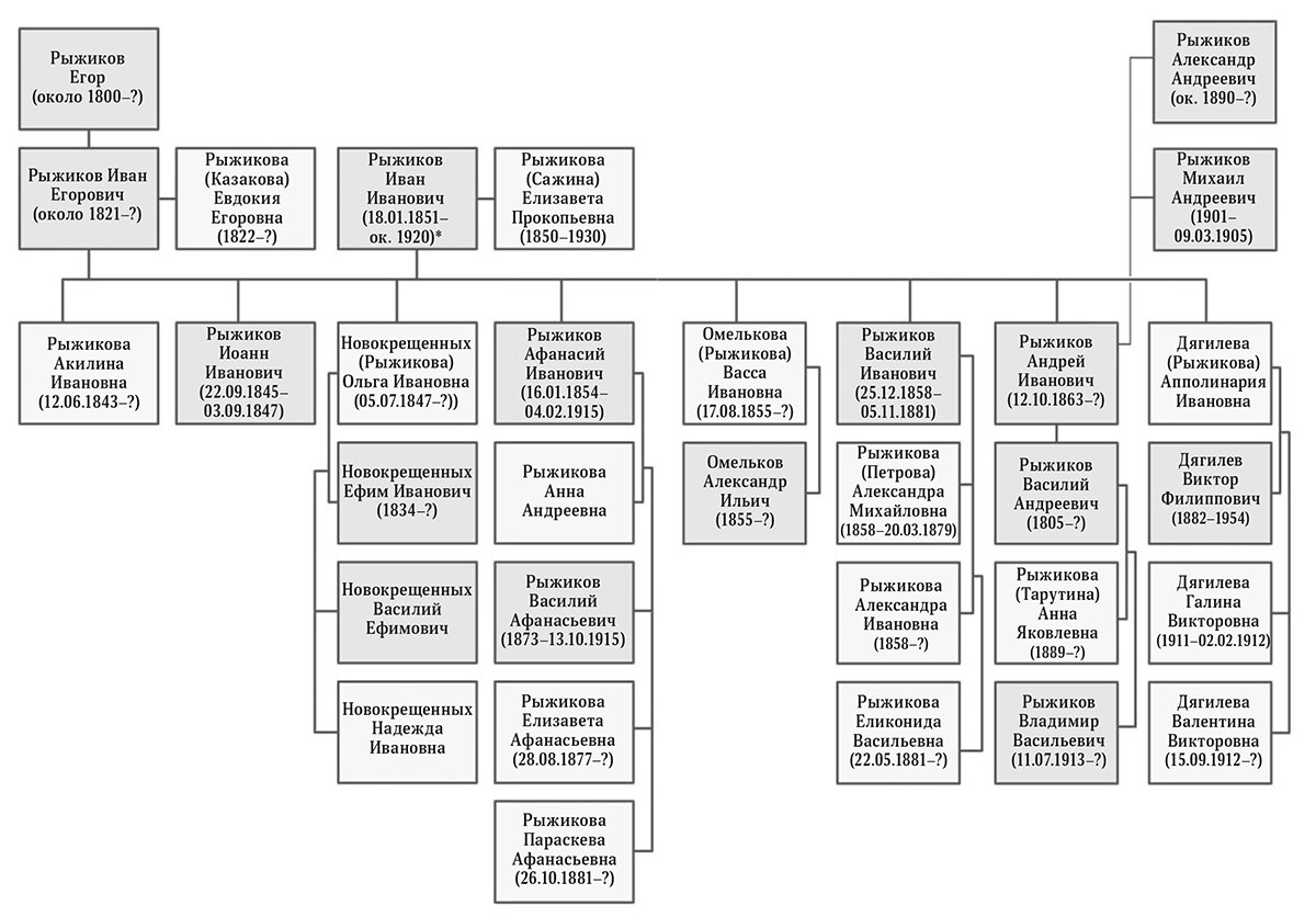 Вывод один: Иоанн Иванович родился 22 сентября 1845 года. Но сохранилась запись в метриках, что 3.09.1847 года Иоанн Рыжиков умирает в возрасте двух лет. Записи о рождении купца Ивана Ивановича Рыжикова пока не найдено. В метрических книгах Успенского собора города Осы и Георгиевской церкви села Дальне-Дубровского я проверил дату рождения, указанную Ириной Фёдоровной. Книги за 1847 год сохранились, но он не мог родиться в этом году, потому что 5 июля 1847 года родилась его родная сестра, Ольга Ивановна Рыжикова[1]. Иван (не Иоанн) Иванович Рыжиков упоминается в числе поручителей со стороны жениха во время бракосочетания его родного брата Василия 31 января 1879 года как мещанин города Осы[2]. Есть метрика на рождение Василия Рыжикова, где отцом записан Иван Егорович Рыжиков[3]. Именно поэтому я считал, что в семье были Иоанн и Иван, но Иоанн умер в возрасте двух лет. Иван Иванович Рыжиков тоже родился в семье рядового инвалидной команды Ивана Егоровича. Совершенно неожиданно, когда текст книги был уже написан, я познакомился с Александром Коноплёвым, геологом из Перми. Оказывается, он давно занимается родословными осинских фамилий, в том числе и Рыжиковыми. Благодаря ему сейчас мы знаем, что главный герой нашей книги родился 18 января 1851 года, уточнены даты некоторых событий, и можно с уверенность говорить, что в семье Ивана Егоровича Рыжикова было девять детей: Акилина (12.06.1843); Иван первый (22.09.1845– 03.09.1847); Ольга (05.07.1847); Иван второй (18.01.1851); Васса (17.08.1855); Афанасий (16.01.1854); Василий (1858–05.11.1881); Андрей (12.10.1863) и Апполинария.