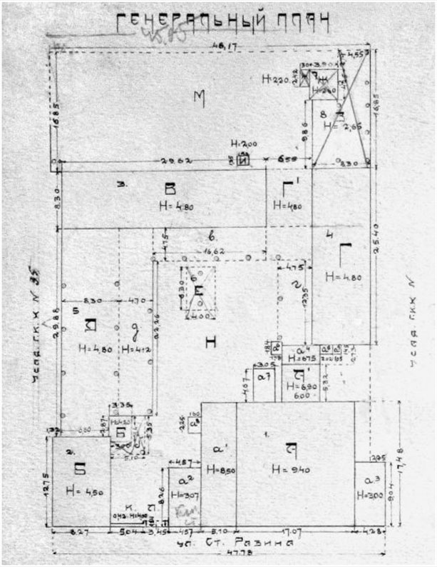План существующих строений и подворного участка, находящихся в г. Осе в квартале № 13 по улице Ст. Разина № 43, принадлежащих Г. К. Х. (городскому коммунальному хозяйству). Бывшая собственность И. И. Рыжикова. Выполнен в 1929 году. Из архива А. Д. Зверева