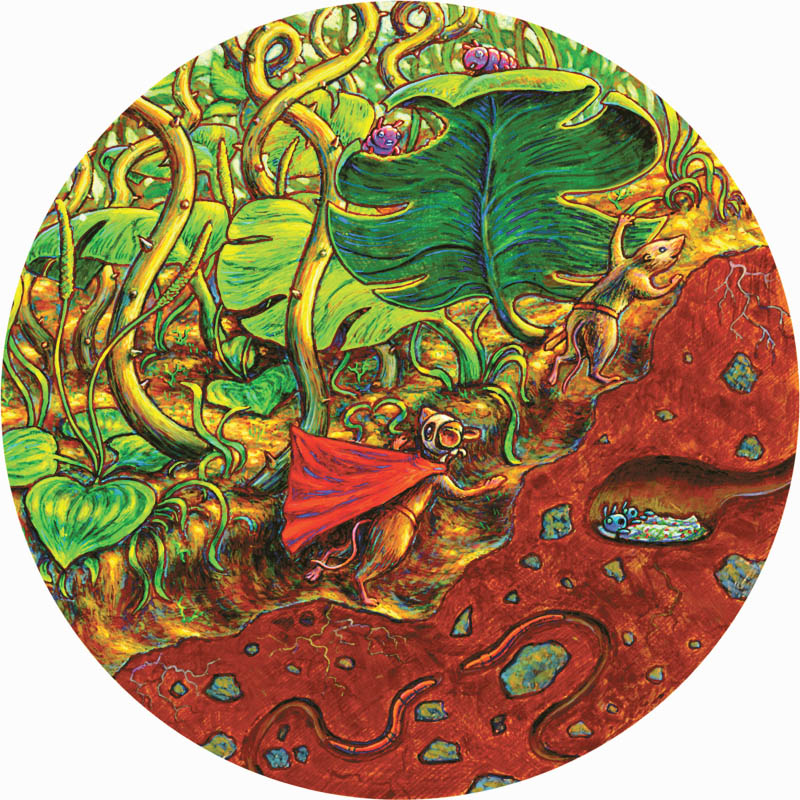 А если прищуритесь и вглядитесь повнимательней, то увидите рядом с Мышонком смешного и ещё более мелкого зверька. Это Землеройка, его умный и ловкий помощник. Эта геройская парочка бросила свои уютные норки, оставила позади всю прошлую жизнь и отправилась навстречу неизвестности.