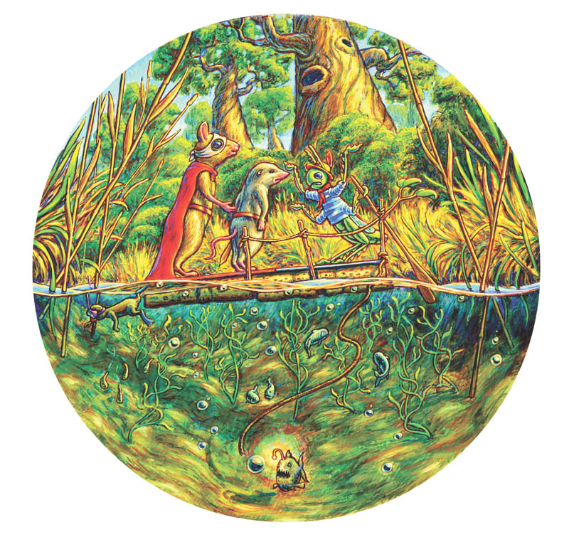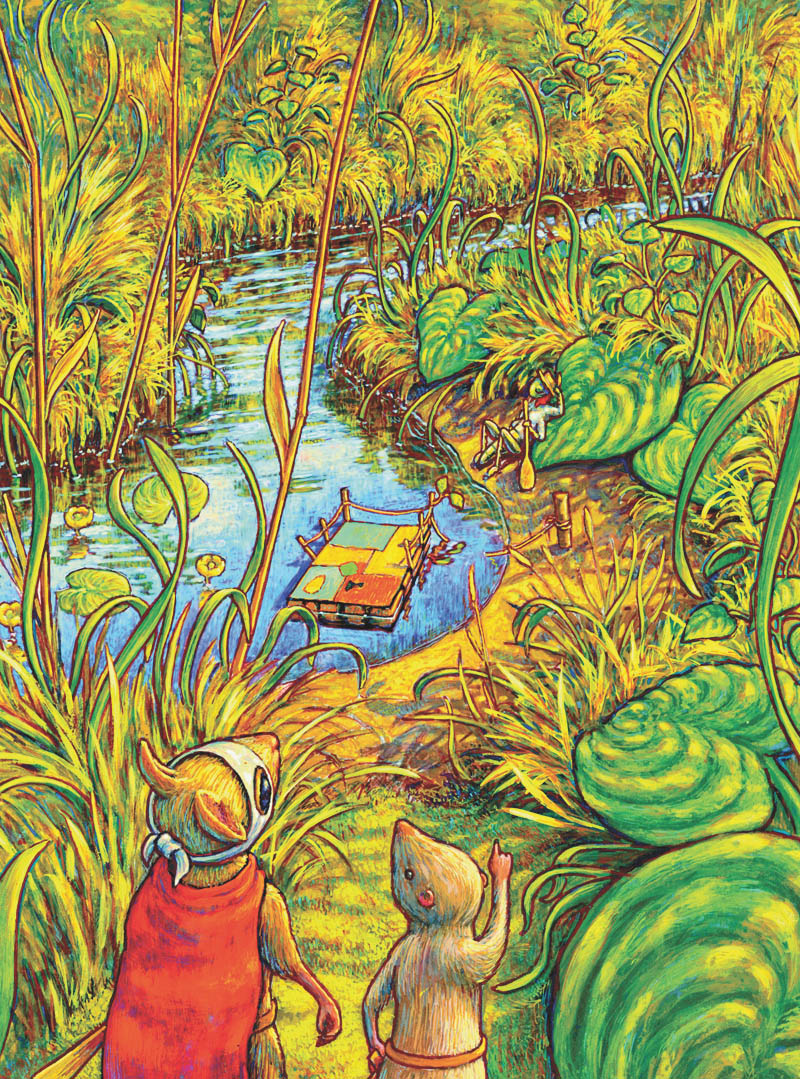 Но тут тропинка оборвалась – Мышонок и Землеройка вышли на берег маленького ручья. Чуть вдалеке стоял паром, сделанный из обломков доски и бутылочных пробок. Это была очень непонятная конструкция, прямо скажем, развалина. На берегу с веслом под мышкой спал зачуханный кузнечик.