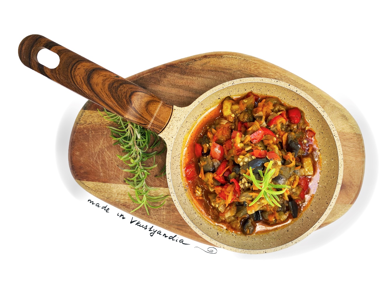 Когда лук и морковь подрумянились, она добавила нарезанные мелкими кубиками баклажаны, красный перец, ну и в самом конце – помидор (точнее сок из помидора).