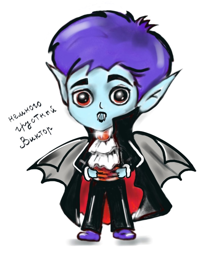 Так вот. В старинном замке, обросшем плющом и паутиной, жил был вампир Виктор. Когда родители вампиры сказали ему, что он должен пить кровь, он несказанно расстроился!