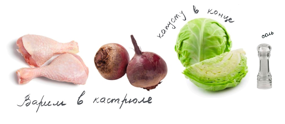 А человек взял кусок куриного мяса и чистую свёклу, положил в кастрюлю и залил водой, немного посолил. Пусть кипит и варится.