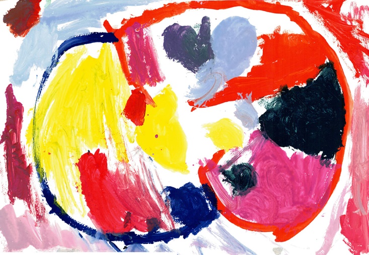 Это яблоко Лера нарисовала в 3,5 года. С самого начала она не боялась больших форматов, смело орудовала широкой кистью, валиком, флейцем, пульверизатором, осваивая пространство листа. И это замечательно. Поддерживайте ребенка, если он уверенно разгоняет краску любым способом. Если же ребенок робко начинает с уголка или мельчит, поощряйте его на «безумства» – пусть шлепает ладошками, брызгает, пачкает бумагу. Главное – преодолеть страх пустого пространства.