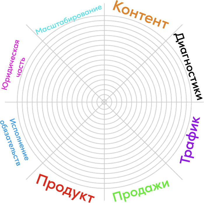 Как видишь, в колесе есть 8 секторов: контент, диагностики, трафик, продажи, продукт, исполнение обязательств, юридическая часть, масштабирование. Пройдись по каждому сектору и заполни от 0 до 10. Насколько у тебя закрыт этот вопрос.