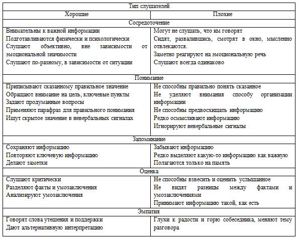 Существуют приемы и негативного слушания: перебивание говорящего, логические следствия и оценки, «хамоватая» реакция, пренебрежение к партнеру. Типы слушателей отражены в табл. 2.