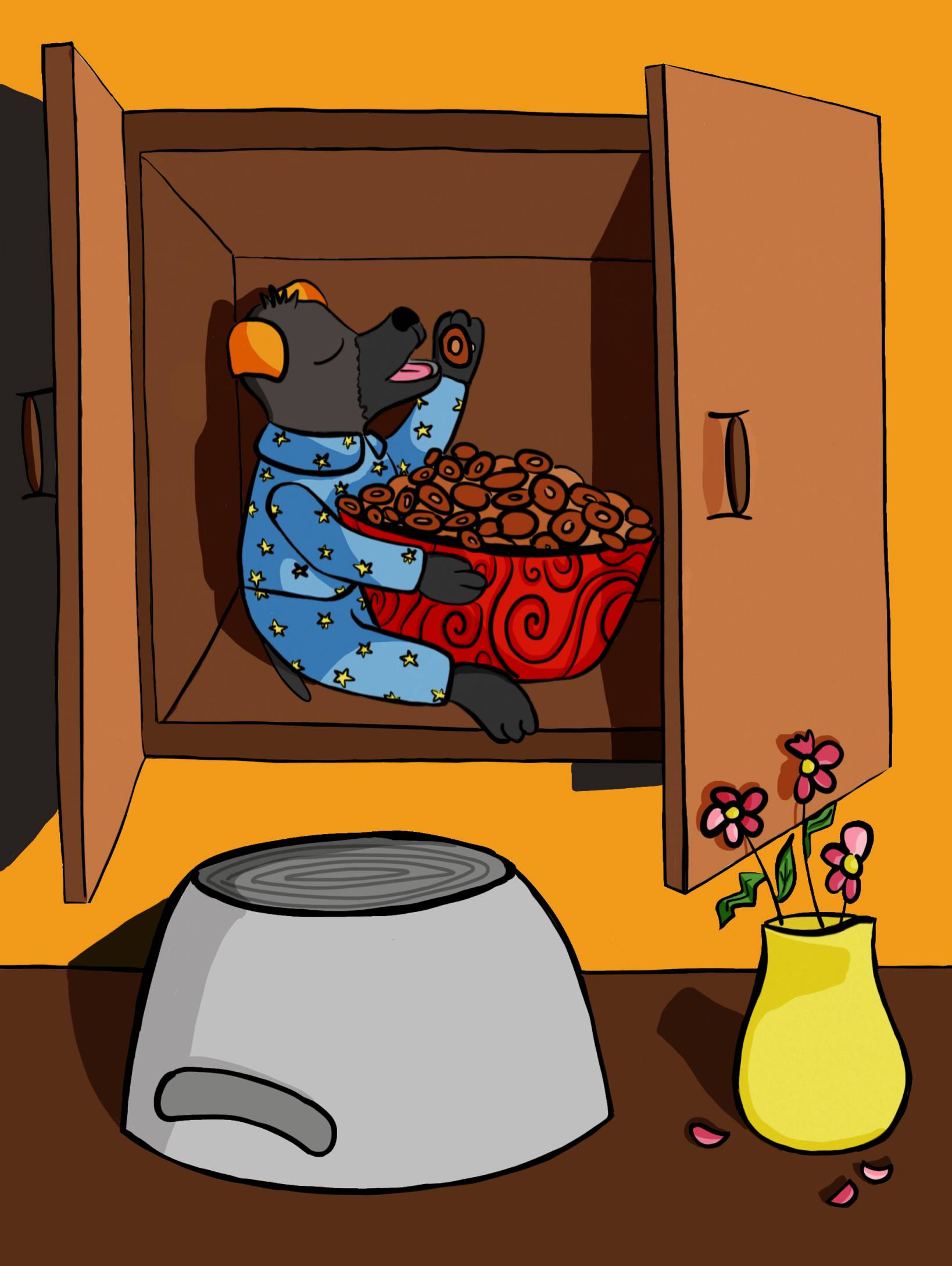 It is night now. Mother and Father are sleeping. I am sleeping. Betsy is sleeping, but Timmy is not sleeping. He goes to the kitchen. He opens the cupboard. He takes the big glass vase with candy. He eats all the candy! Then he goes to sleep.
