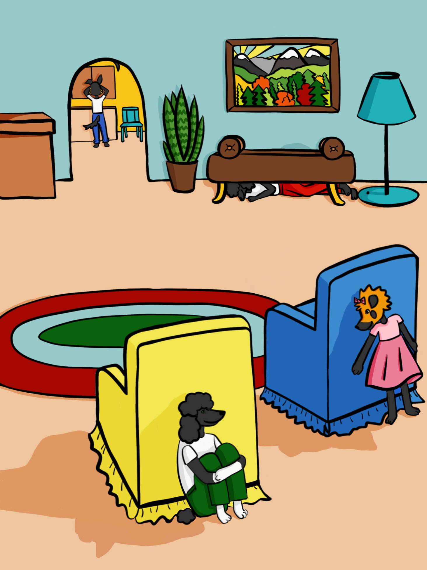 Then I open my eyes. I start to search. There are two big armchairs in the living room. One armchair is blue and one armchair is yellow. I look behind the yellow armchair and I see Bill!