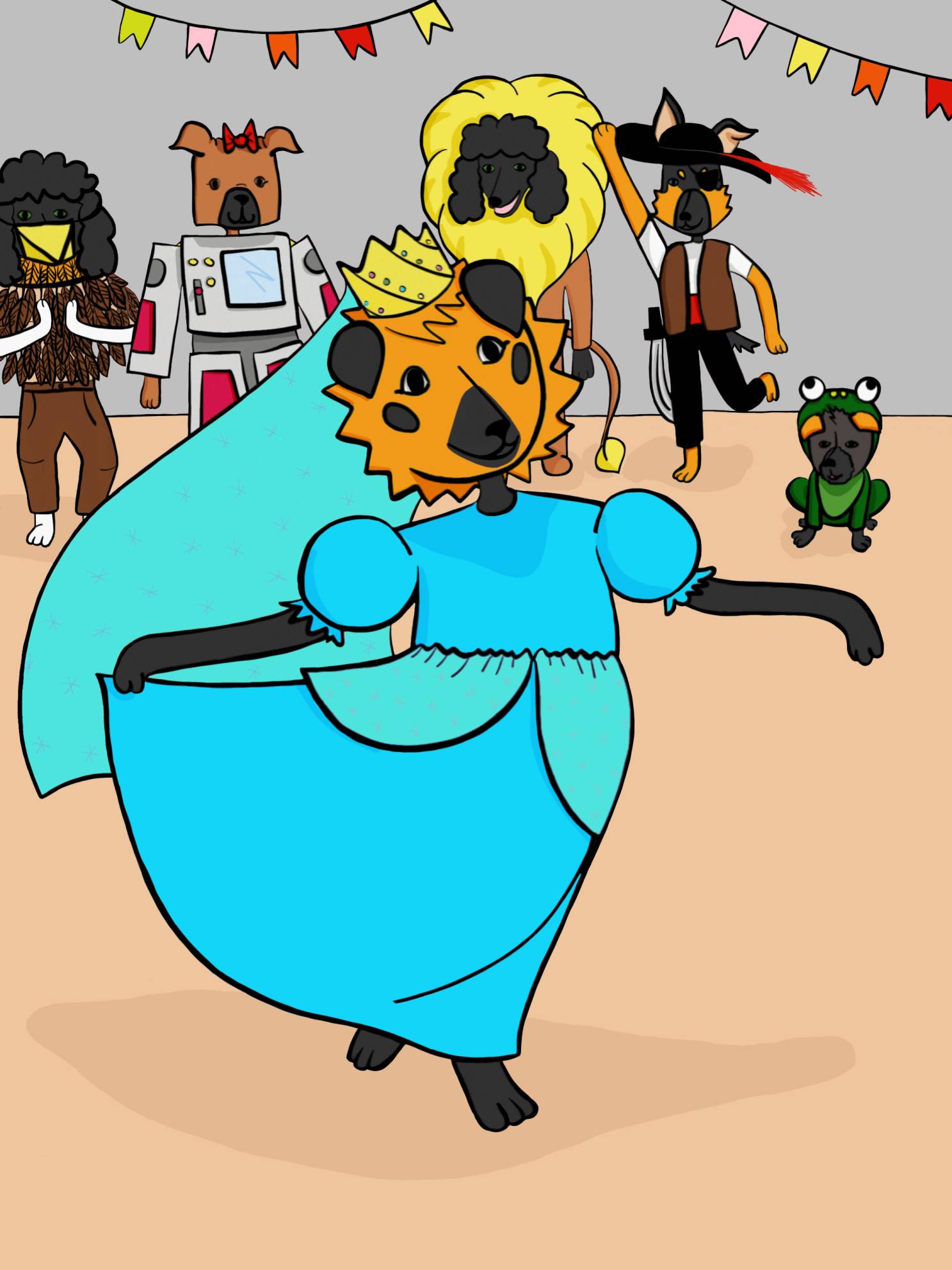 The party starts. There are a lot of puppies at the party. They are all our schoolmates. All puppies have got different costumes.