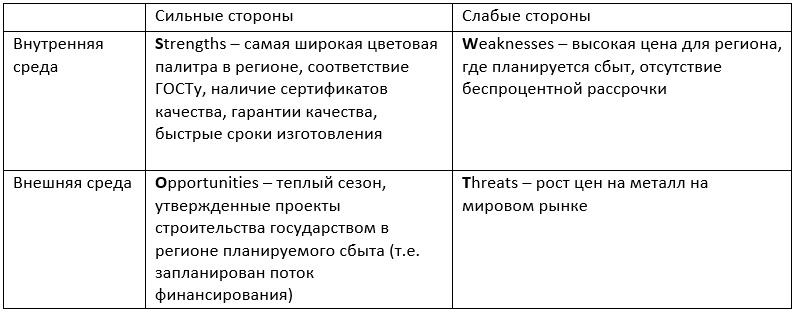 SWOT-анализ позволяет оперативно оценить ситуацию. Он ложится в основу будущей стратегии развития. Возьмем для примера частную компанию, занимающуюся производством изделий из тонкого листового металла. Задача на сезон – получить как можно больше заказов на металлочерепицу.