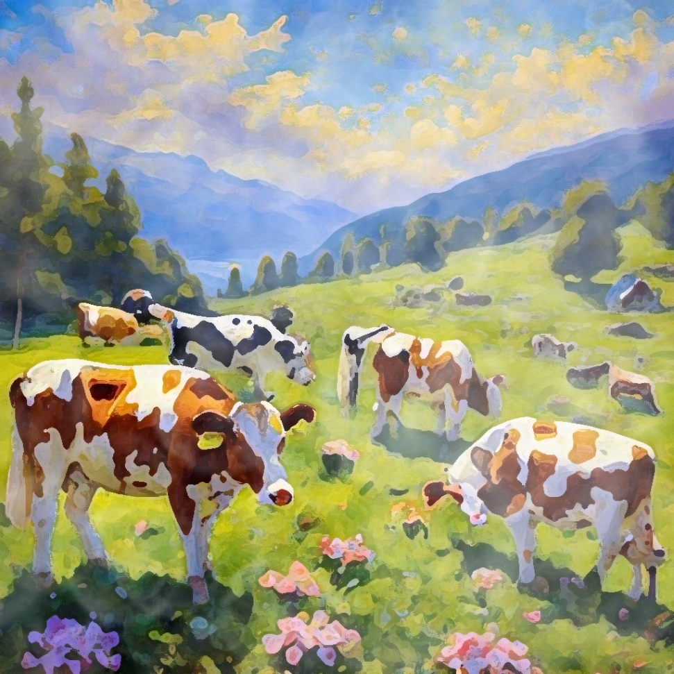 После нескольких часов путешествия, лес закончился, и перед взором открылся величественный луг, простирающийся до самого горизонта. На зелёной траве мирно паслось стадо коров и несколько коз, создавая вокруг себя невероятную ауру спокойствия.