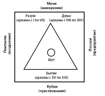 В центр помещен круг, изображающий человеческую душу – нулевой аркан Шут. Треугольник вокруг центра соответствует Старшим арканам, представляет тройственную сущность божественного, символизирует непроявленный мир. Четыре стороны квадрата вокруг треугольника соответствуют четырем мастям Младших арканов. Квадрат символизирует физический, проявленный мир. Остановимся пока на Старших.