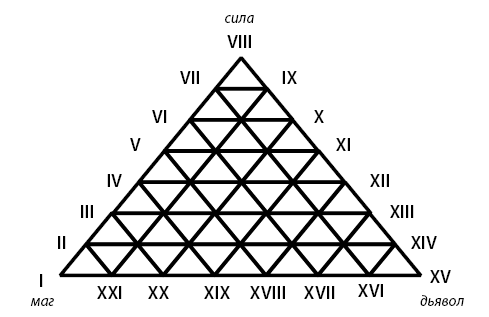 П. Успенский считал целесообразным парные рассмотрения арканов. Он писал, что «при таком расположении один лист объясняет другой, а главное, показывает, что их можно объяснять только вместе, но не порознь»[16]. Если в равностороннем треугольнике распределить Старшие арканы в соответствии с рисунком, то в вершинах треугольника оказываются Маг, Сила и Дьявол, а линии образуют связи (потоки энергии) и пересечения этих связей. Так, каждый аркан получается в непосредственном контакте еще с четырьмя, а опосредованно – со всеми.