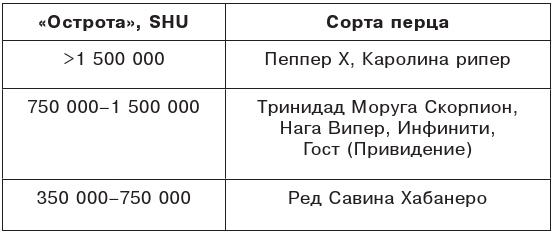 В таблице ниже вы найдете известные сорта острого перца, расположенные в порядке убывания остроты. Честно вам признаюсь, что я выше «Серрано» не продвинулась! И даже он для меня невыносимо острый. Не представляю, как другие люди могут пробовать и даже любить, например, «Хабанеро» и не могут ни дня прожить без соуса «Табаско».