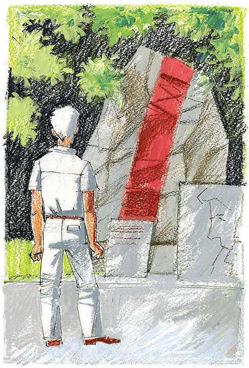 Неожиданно шофёр затормозил, съехал на обочину, а Василий Васильевич вышел из машины, подошёл к серому камню с красной наискосок полосой, постоял около него, наверно, целую минуту, и мы снова поехали.