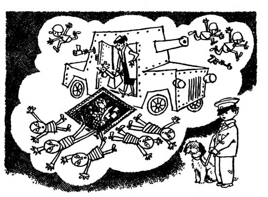 Я представил, как доверчивая тётенька открыла дверь броневика, у неё из рук вырвали картину, но тут из сумки с «молниями» закукарекал Петушок – Золотой гребешок, и все бандиты от страха попадали на землю с поднятыми руками…
