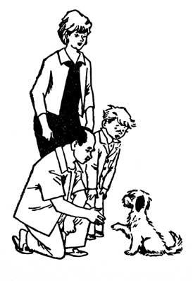 Папа присел на корточки, протянул руку к щенку и сказал: