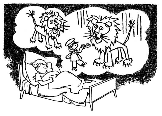 Уснул я, представив себя директором зоопарка. Я вошёл в обеденный перерыв в клетку ко львам и угостил их бутербродом с колбасой, но львы не захотели его есть, чтобы не перебивать аппетита перед едой: им в клетку сторожа уже закинули куски мяса. И мне ни капельки не было страшно в львиной клетке…