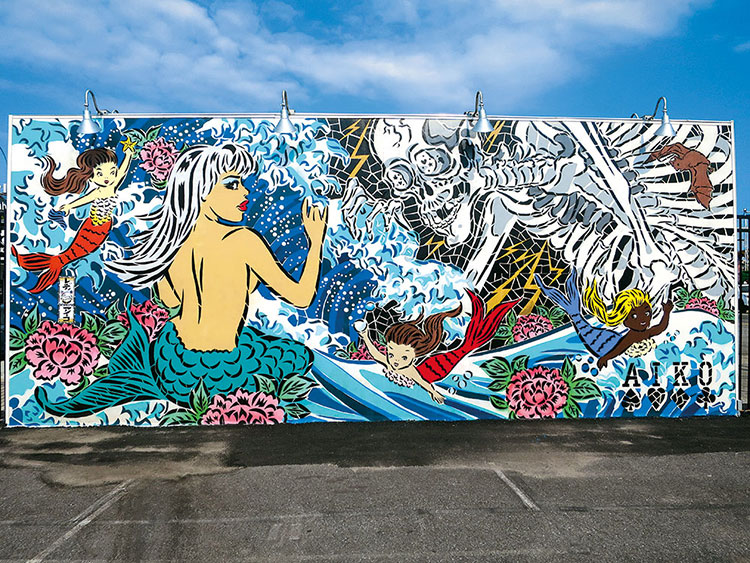 АЙКО – художница, работающая в традиционной технике трафаретного граффити. Но ее подход сейчас – большая редкость, ведь она сама вырезает трафареты, а затем, даже на очень масштабных стенах, раскрашивает их вручную. Ее творчество выделяется на общем фоне величественным и чарующим объединением Востока и Запада, а также благодаря сексуальным, обольстительным женским образам, сильным и непреодолимо притягательным, которые, как и она сама, невольно привлекают взгляд. Ее муралы уникальны – зачастую они огромны, при этом всегда незабываемы и способны прочно запасть в душу. АЙКО, она же ЛЕДИ АЙКО (LADY AIKO), родилась в Японии, но сексистская культура ее родины с самого детства душила ее ограничениями, и это стало причиной ее переезда в Нью-Йорк, который сразу же вдохновил ее. «Я родилась и выросла в центре Токио. Меня всегда окружала богатая культура и прекрасные древние традиции. Мое детство можно назвать счастливым, потому что я могла свободно учиться пению, танцам, письму, рисованию и музыке. Большую часть времени я занималась выражением собственной версии чего угодно, чем развлекала окружающих», – с ноткой ностальгии в голосе вспоминает она. «В три года я уже лазала по лестницам и, вместе с друзьями, радостно раскрашивала стены в детском саду. Видимо уже тогда где-то глубоко в душе я знала, что хочу связать жизнь с искусством. Меня и по сей день отличает та страсть, радость и преданность труду. Семья поощряла мои разношерстные увлечения, стойко перенося любые перемены в моей деятельности. Когда я была подростком 1980–90-х годов, меня очаровали зарубежная андеграундная культура, независимый кинематограф, поп-арт, панк и электронная музыка; но из-за ограниченного доступа этого было мне недостаточно. Я постоянно испытывала жажду большего. Кроме того, с моими интересами и взглядами я осознала, что не вписываюсь в стереотипное японское общество, где доминируют мужчины. Меня это крайне разочаровывало. Еще школьницей я поняла, что патриархальная культура не позволит мне добиться успеха в живописи», – признается она.