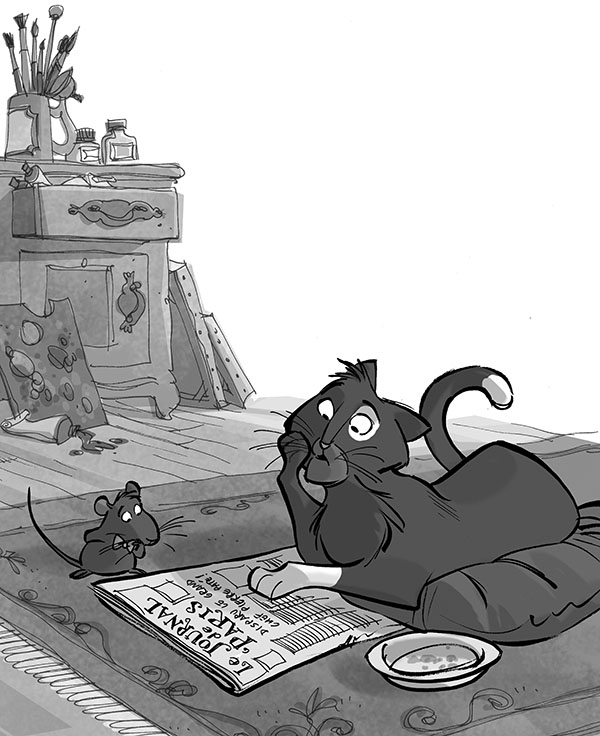 Через некоторое время Мышелло вернулся, волоча по полу миску лапками. Он поставил её перед подушкой, на которой кот уютно свернулся клубком. Затем мышонок засеменил к выходу и вскоре появился вновь, но уже с газетой.