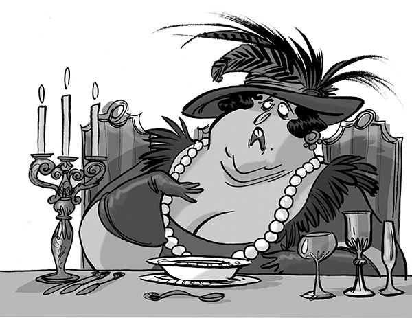 Огромный стол был накрыт только на одну персону. Там сидела госпожа столь внушительных размеров, что вместо одного сиденья она занимала сразу три, поставленных рядом, чтобы уместился её необъятный зад.