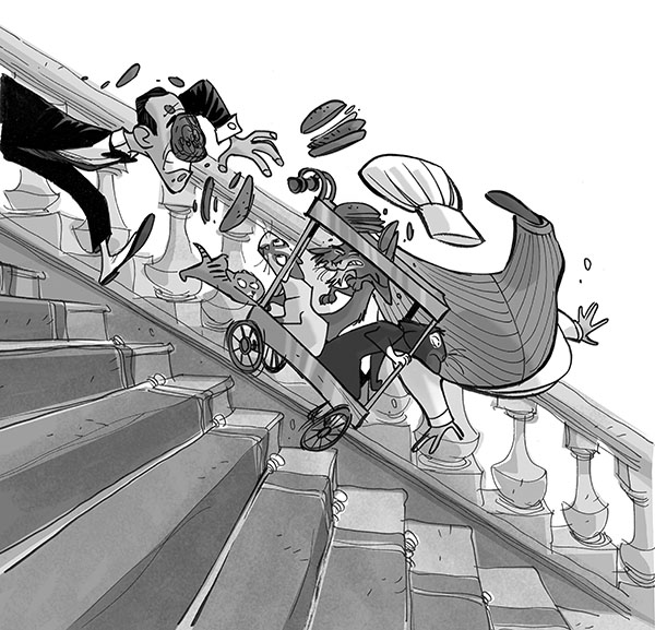 Тележка с налету сразила повара, ударив его прямо по коленям. Повар потерял равновесие и опрокинулся назад, а тарелки с деликатесами взлетели в воздух.