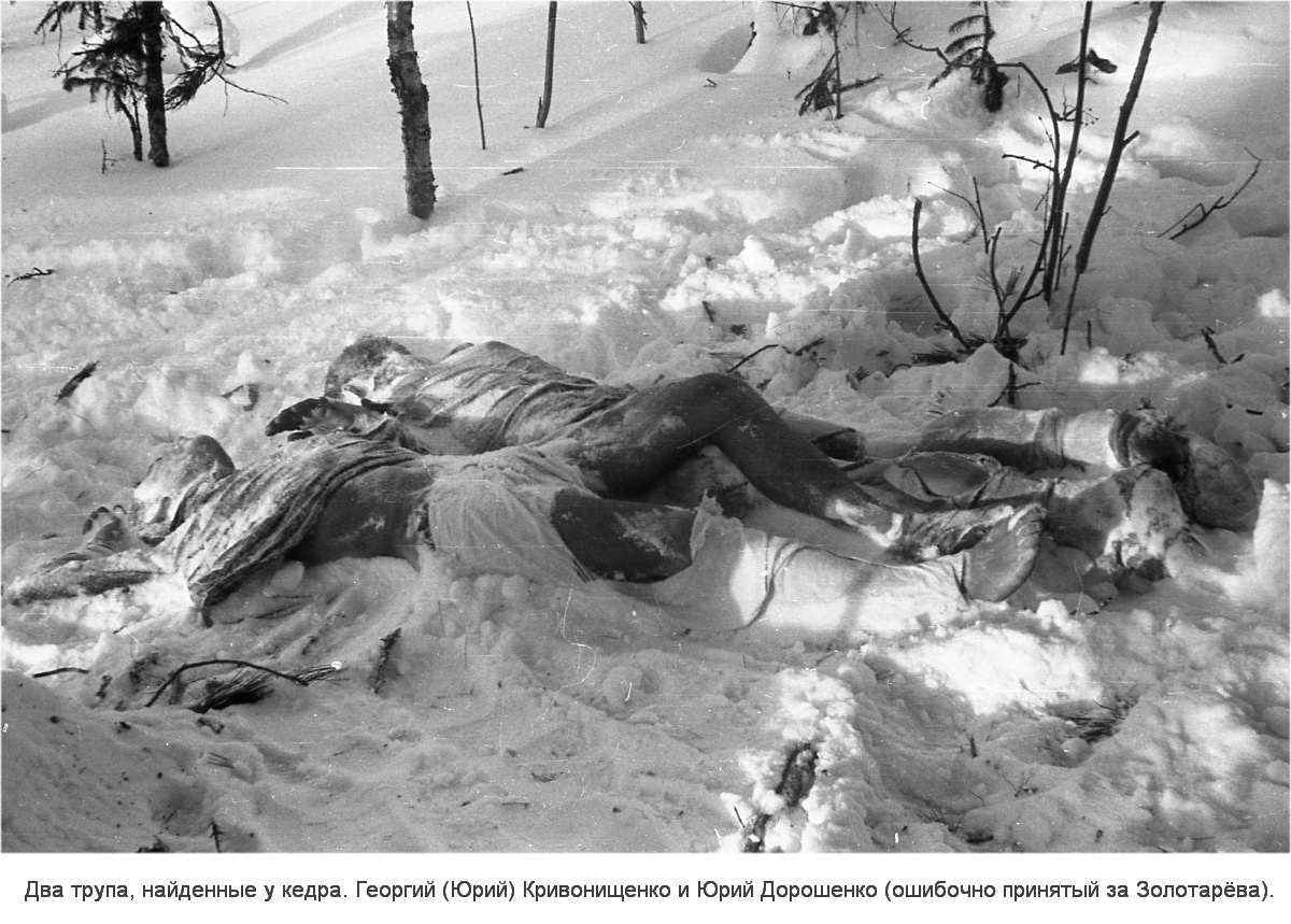 […] Составили настоящий протокол обнаружения трупов, обнаруженных на северо-восточном склоне высоты «1079». К северо-востоку от высоты «1079» в полутора километрах в истоках правого истока реки Лозьвы, начинающихся в седловине между высотами «1079» и «880» около кедра в 2 – 2,5 метрах обломаны сухие сучья. Сучья обломаны и на самом кедре. Под кедром в ямке обнаружены следы от костра, о чем свидетельствуют полуобгоревшие сучья. Около костра обнаружен полуобгоревший носок и рубашка-ковбойка. В рубашке деньги – 8 рублей. Полусгоревший подшлемник зеленоватого цвета. К северу от костра на расстоянии одного метра головами на запад, ногами на восток рядом лежат трупы в количестве двух. Опознаны: Кривонищенко Юрий Алексеевич лицом вверх, одет в рубашку ковбойка, порваны кальсоны. Голова откинута, глаза закрыты, рот закрыт, губы сжаты, правая рука заброшена за голову, левая рука согнута, кисть приподнята над грудью. Правая нога вытянута, левая – слегка согнута в коленях. Правая нога разута, на левой одет порванный коричневый носок идентичный обнаруженному полусгоревшему у костра. На тыльной стороне левой ладони содрана кожа. Между пальцами кровь. Указательный палец ободран. Кожа на голени левой ноги содрана, выступила кровь. Других телесных повреждений при внешнем осмотре не установлено. Рядом с ним с Кривонищенко, лежит труп Золотарёва (ошибка?) Александра Алексеевича. Труп лежит животом вниз. Одет в ковбойку, синие трусы, под ними кальсоны голубого цвета – порваны. На ногах шерстяные носки сверху – порванные трикотажные носки. Ухо и нос в крови, губы окровавлены. На левой руке средний палец окровавлен. Трупы сфотографированы на месте преступления.