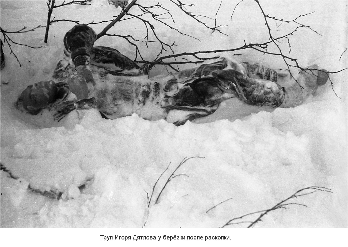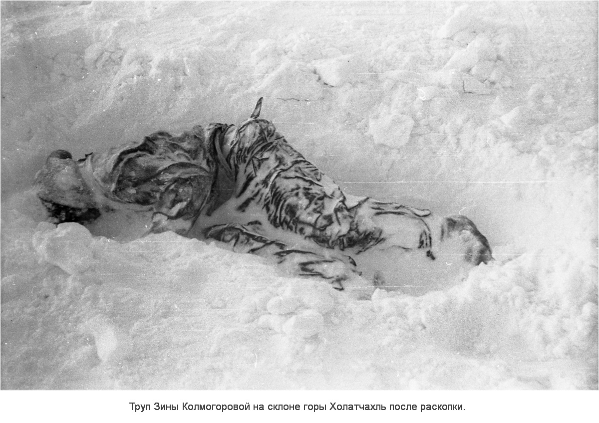 Труп находится в снегу, находился под пластом твердого фирнового снега. Поблизости в радиусе на расстоянии 70 метров нет ни одного дерева. Труп лежит головой в том же направлении, как и предыдущие трупы лицом к земле на правом боку. Руки согнуты, находятся под телом. Обе ноги полусогнуты. Правая подтянута к животу (создается впечатление, что человек карабкался в гору). На голове шерстяная розовая шапочка. На тело одета лыжная куртка, под ней майка и ковбойка. На ногах одеты лыжные брюки, под ними рейтузы и нательное белье. На ногах шерстяные носки. Лицо в крови. На спине около поясницы ссадины, выступила кровь. Можно предположить о том, что Колмогорова согласно расположению тела старалась не карабкаться, в гору, а удерживаться на месте. Труп сфотографирован.