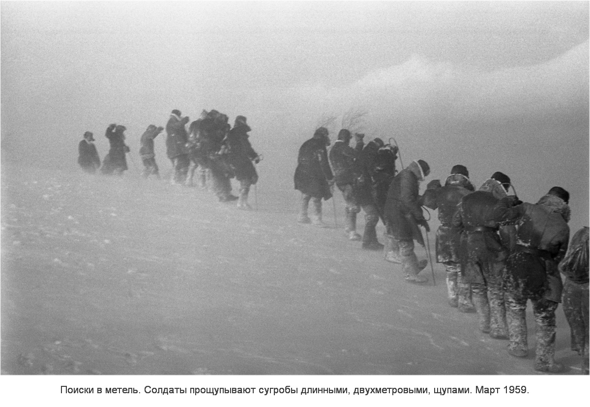 – Утром лагерь поднимается в 8 часов, кушает и идёт на поиски. От лагеря до поисков 3 километра. В 9—10 часов люди выходят на поиски. С большим трудом взбираются на перевал. До него 1,5 километра, до вершины. Вспотеешь так, что свитера у меня были мокрые. Ветер такой, что штаны срывает на перевале. Поднимаясь на него, часто падаешь. Затем спускаемся, встали в ряд локоть к локтю и штырями через каждые 0,5 метра. Штыри пробивали снег. Это человек 20—25. Так наковыряешься. Штырь часто упирается во что-то под снегом. И с мыслями, что это труп, начинаем копать лопатой, ожидая увидеть мертвеца. Но опять камень.