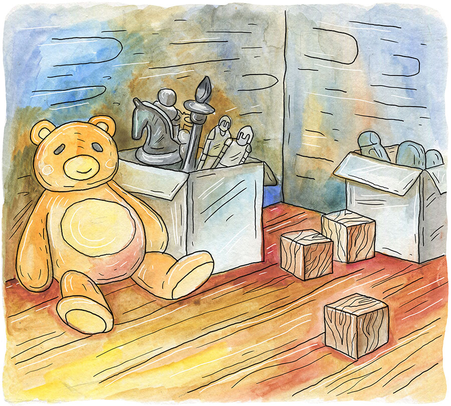 В этом сундуке Уф и разместил свои игрушки: три оловянных рыцаря, несколько шахматных фигур, таинственный ключ и деревянные кубики.