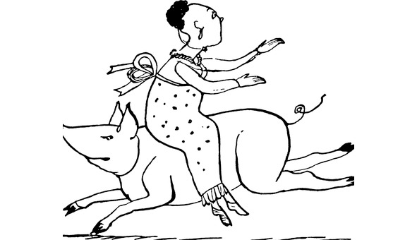 И её королева Неряха отпустила, но наказала далеко в лес не уходить. С ней пошли её служанки Анка- оборванка и Майка- неумывайка. Корзинки в доме никогда не было, вот и взяла Ряшка старую ржавую кастрюльку. Чуть-чуть прошла Ряшка, только от дома отошла немного, вернулась назад. «Ножки мои не хотят идти, им надо чтобы кто-то их вёз,» -захныкала Ряшка. Зашла Ряшка в свинарник, там лежала огромная свинья, Ряшка решила на ней до леса доехать. Села она на свинью, а кастрюля то мешает, как ей за уши свиньи держаться?.. Вот она и надела кастрюлю на голову. Свинья, увидев на спине своей такое чудище, галопом понеслась вперед. Ряшка крепко ухватилась за уши свиньи. От боли от страха свинья с визгом пролетела свой лесок, пробежала по полю, и попала в чужой лесок, который был в соседнем королевстве. Там собирали ягоды Тюля, девочка Семиделочка и Марья искусница.