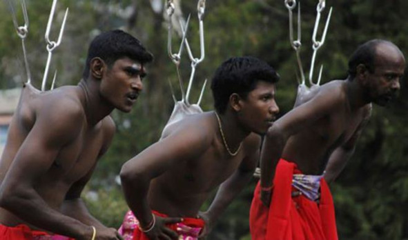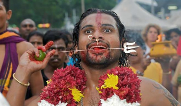 Тайпусам – индуистский праздник, отмечаемый в разных странах по всему миру, включая Шри-Ланку, Индию, ЮАР и Малайзию. Они прокалывают себе щеки и кожу на теле спицами и крюками, к которым прикрепляют украшения, они могут весить более 30 килограммов.