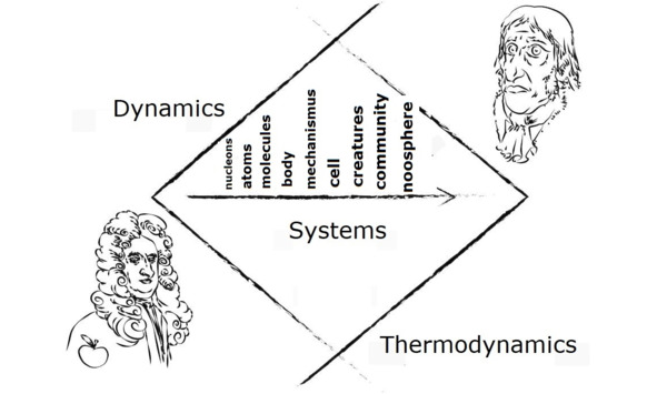 In the area of systems, which man has been looking at since time immemorial as objects of his influences, there are three main postulates, which physicists called the Beginnings of thermodynamics. Closer to the tip of the beam, that is, where there are systems over which a person no longer has power as over a gas or liquid in a vessel, at least because he himself is a particle of them – these are biological or social objects, there are patterns of non-equilibrium systems. And in the very tip of the second ray, one can assume the existence of still undiscovered fundamental laws of the balance conservation, which should unite all nested systems – both galaxies, and cyclones, and life forms. However, the laws of the highest level could be discerned only by one who is at the very tip of the beam – who can look down on everything in any of its complexity, who is above everything – that is, the Almighty. Science is still very far from such heights. Even the existence of alien life forms is still only a hypothesis.