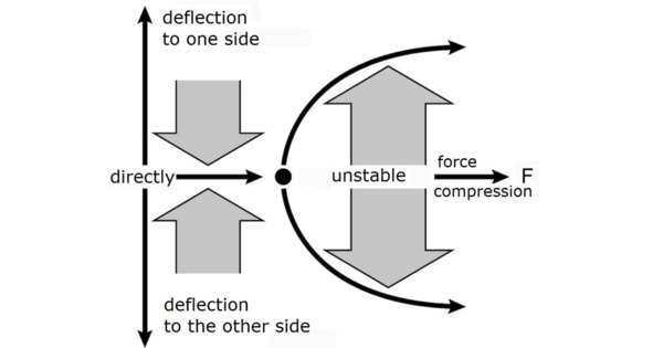 We will not write the equation, as we promised, but we will only say that it has a unique solution only up to a certain compression. And at this critical point, the solution loses stability. If we imagine that we have an absolutely perfect bar of gum inside and out, and we press our fingers strictly along its longitudinal axis, the gum will continue to shrink without bulging. But this will already be an unstable segment of solutions. Just as a ball can, in principle, stick to the top of a convex surface, but only in an absolutely ideal case.