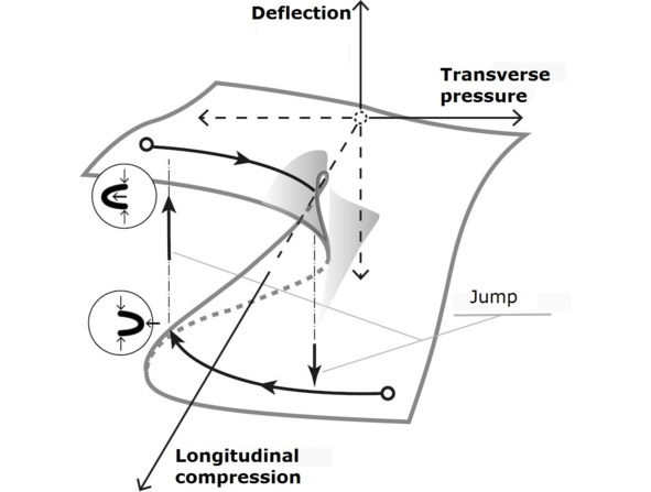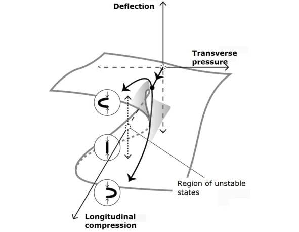 Our «antistress» with a certain effort will begin to flip in the opposite direction. If we draw a set of solutions to the equation in the parameter space: Deflection / Longitudinal pressure / Transverse pressure, then we will find a funny surface in it, similar to the assembly of a fabric. This surface is in a section of mathematics called Catastrophe Theory and is called Cusp catastrophe.
