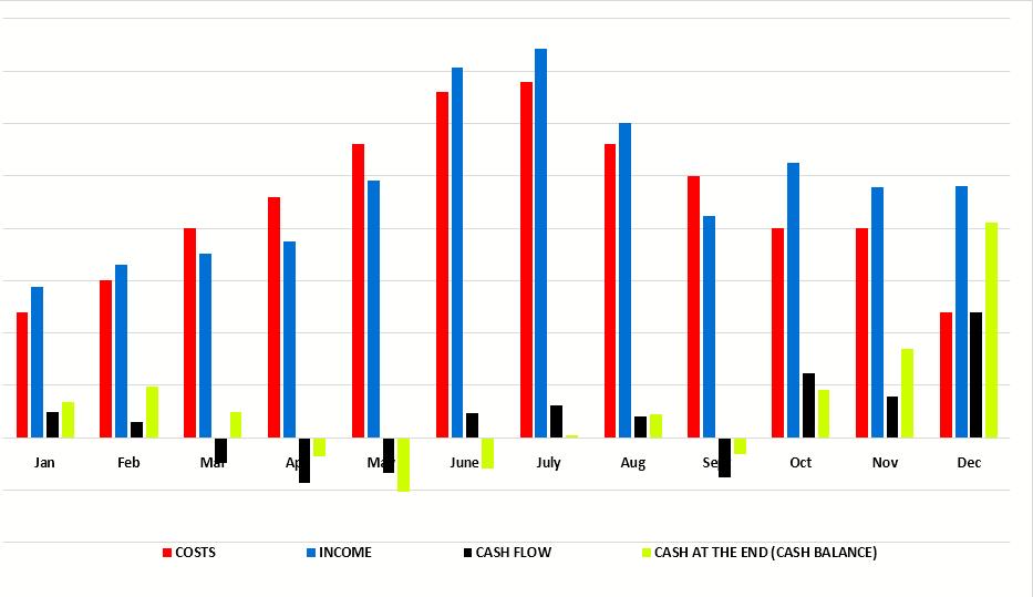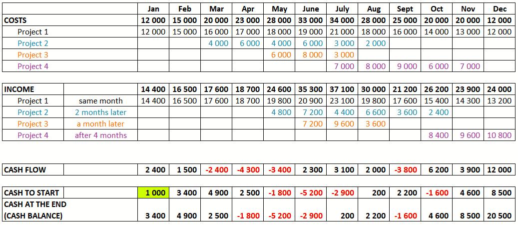 The principle of constructing cash flow ( cash flow ) is very simple, but very informative. We need to compare monthly revenue with expenses. You can accept other periods – at least a week, at least a quarter – but usually all payments occur within one month, and the consolidation of periods is acceptable for long-term planning of future and long-term projects, and not current and those that are already on the way.