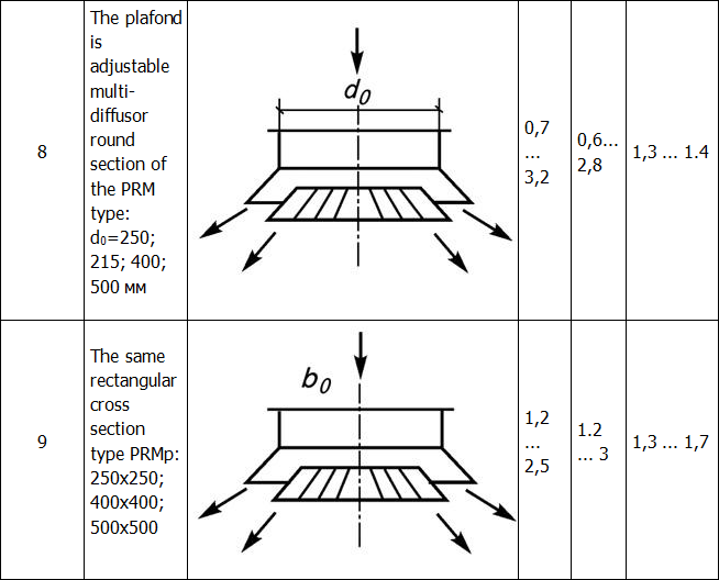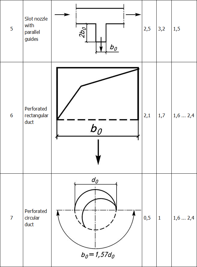 Table 5.1 shows the schemes of air distribution devices and their main characteristics: aerodynamic coefficient m, temperature coefficient n and local resistance coefficient ξ. The coefficients m and n characterize the rate of attenuation of air velocity and temperature in the supply jet.Such indicators are necessary to calculate the speed and temperature of the air in the working area of the premises.