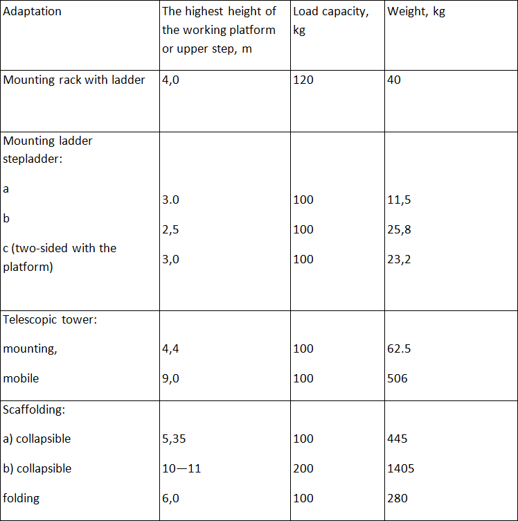 Basic data of non-self-propelled inventory means of scaffolding and rigging