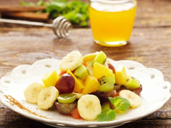 Slices of white bread with honey, top with various sliced (if necessary) fruits and berries – to taste.
