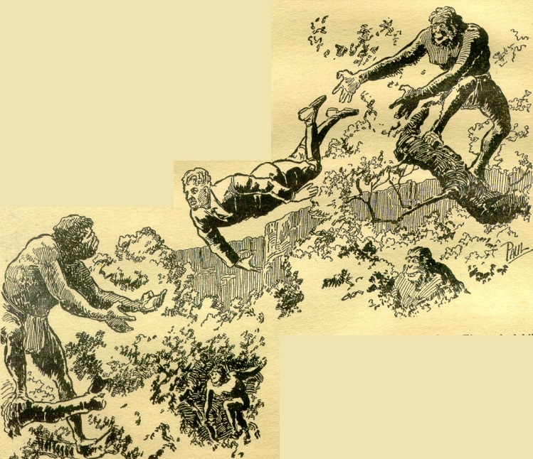 Ошеломленный, я огляделся и обнаружил, что нахожусь на узкой скальной полке с пропастью сверху и снизу. Передо мной вдаль простирался лес с красными листьями, а чуть выше уступа, на котором я сидел, огромное дерево простирало ко мне свои ветви. Пока я пытался собраться с мыслями, несколько человеко-обезьян выбежали на ветку этого дерева, подпрыгнули в воздух и, подобно гигантским белкам-летягам, пролетели через разделяющее пространство и легко приземлились на камень рядом со мной. Это было более чем удивительно, это было на самом деле невероятно, что какое-либо человеческое существо может быть настолько уверенным, настолько проворным, чтобы совершить этот подвиг,